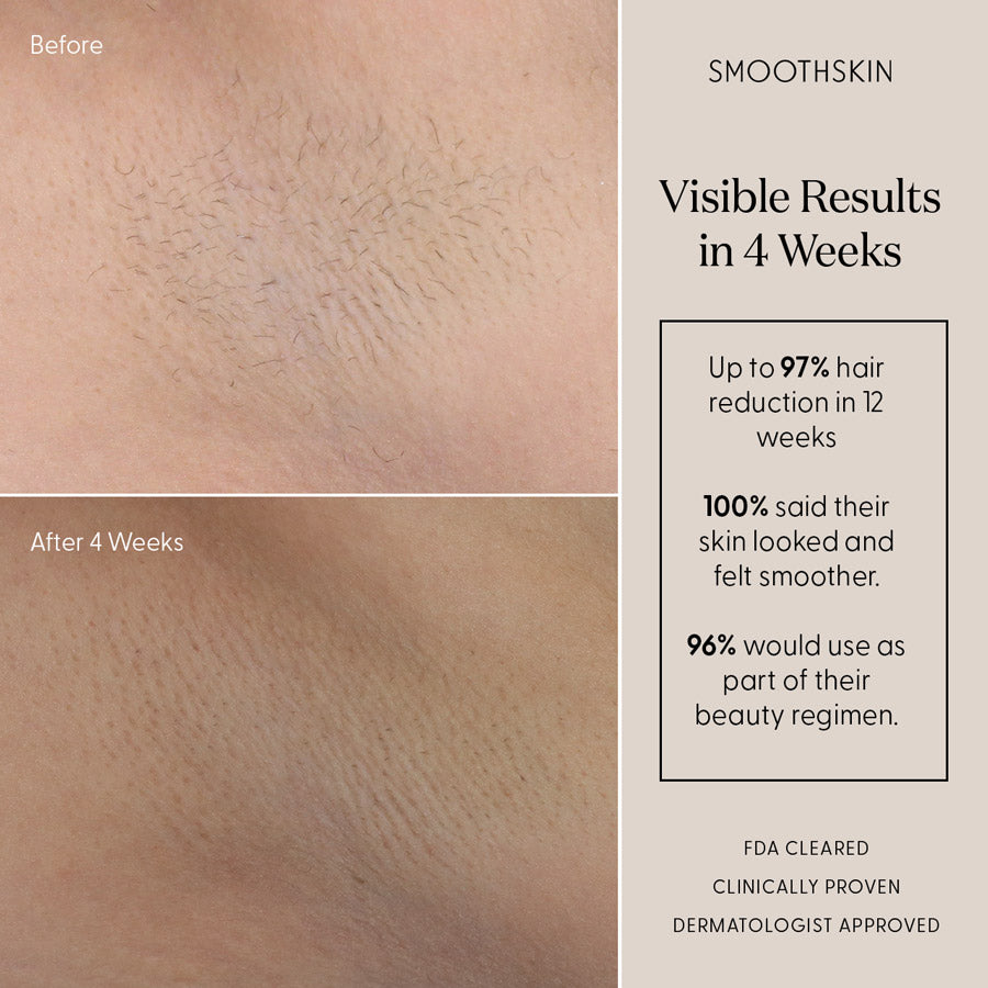 SmoothSkin Bare Fit is safe, effective, and ultrafast! Experience noticeable results in as little as four weeks. FDA cleared for use on your body and face, you can complete a full body treatment in just 10 minutes. With simple one-touch operation and a built-in skin sensor for maximum safety, daily shaving and salon visits will soon be a thing of the past.